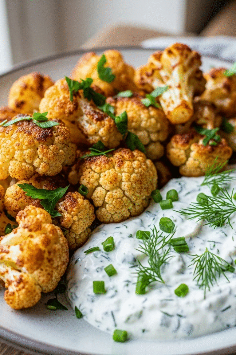 6. Step 6: Den fertigen Airfryer Blumenkohl mit dem Kräuterquark servieren. Sofort genießen!