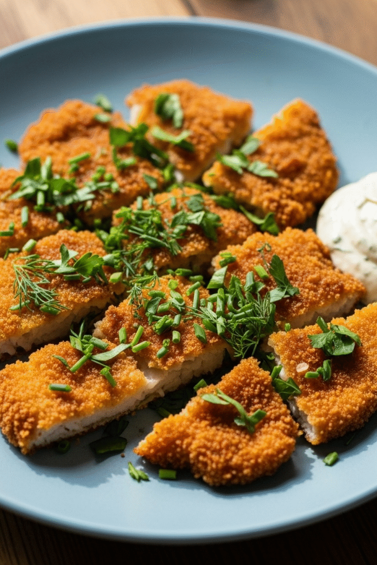 Zarte Kohlrabischeiben, umhüllt von einer knusprigen, goldbraunen Panade, vereint mit dem frischen Aroma duftender Kräuter – ein Fest für die Sinne.