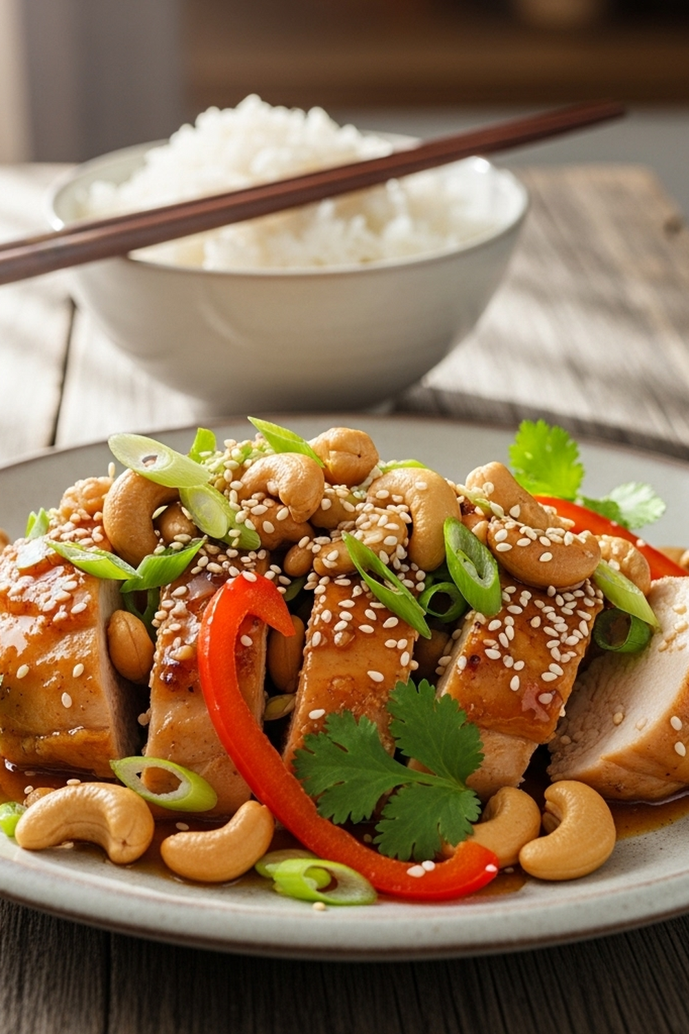 Asiatische Hähnchenbrust, goldbraun gebraten, duftet nach Ingwer, Knoblauch und einem Hauch von Chili.Jeder Bissen Ein Herzhaftes ist ein Fest aus zartem Hähnchen, knackigen Cashewkernen und einer süßherzhaften Soße.