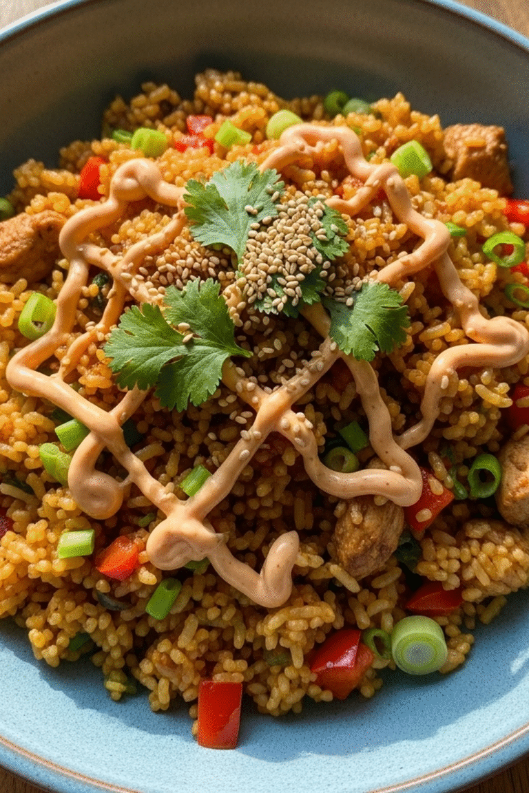 • Serviere den gebratenen Reis mit einem extra Klecks Bang Bang Sauce und gerösteten Sesamsamen für den besonderen Kick.