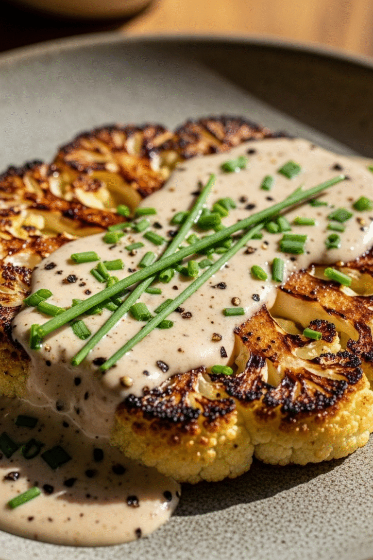 Dieses Blumenkohlsteak mit cremiger Pfefferrahmsauce ist mehr als nur ein Gericht: Es ist eine kulinarische Offenbarung. Es ist ein Gericht, das beweist, dass vegetarische Küche alles andere als langweilig sein muss. Die Kombination aus dem herzhaften Blumenkohl und der cremigen, pfeffrigen Sauce ist einfach unwiderstehlich.