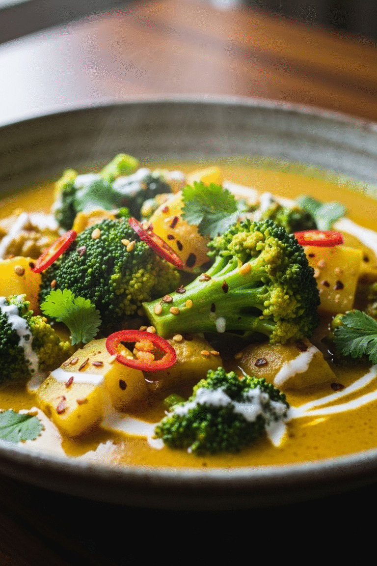 Ein Duft von gerösteten Gewürzen, cremiger Kokosmilch und knackigem Brokkoli erfüllt die Luft. Jeder Bissen ist eine Explosion von Aromen, die süß, herzhaft und leicht scharf zugleich sind.