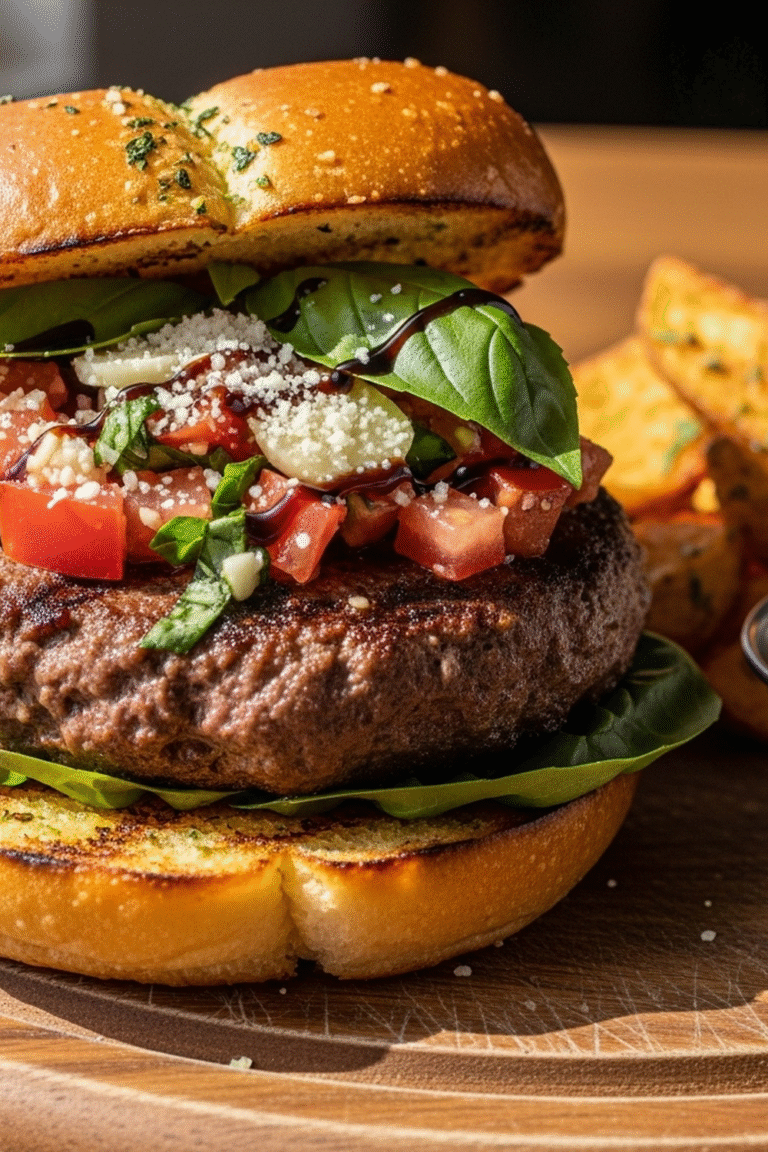 Delicious bruschetta-burger recipe with detailed instructions and nutritional information.