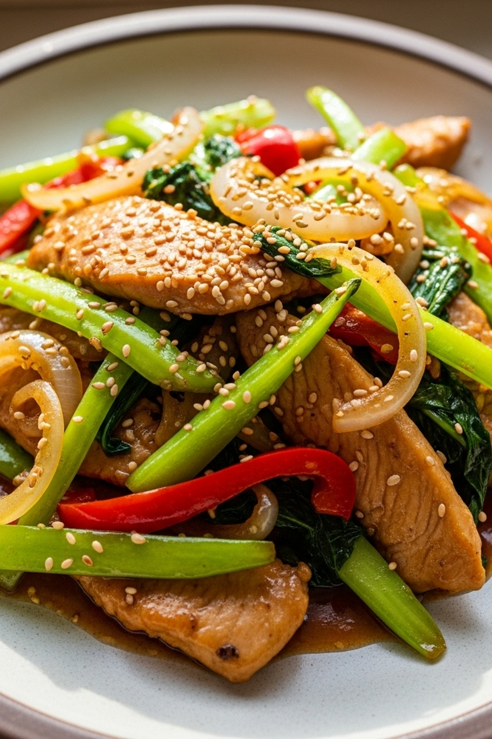 Chinesische Hähnchenpfanne mit Spitzkohl und Zwiebel