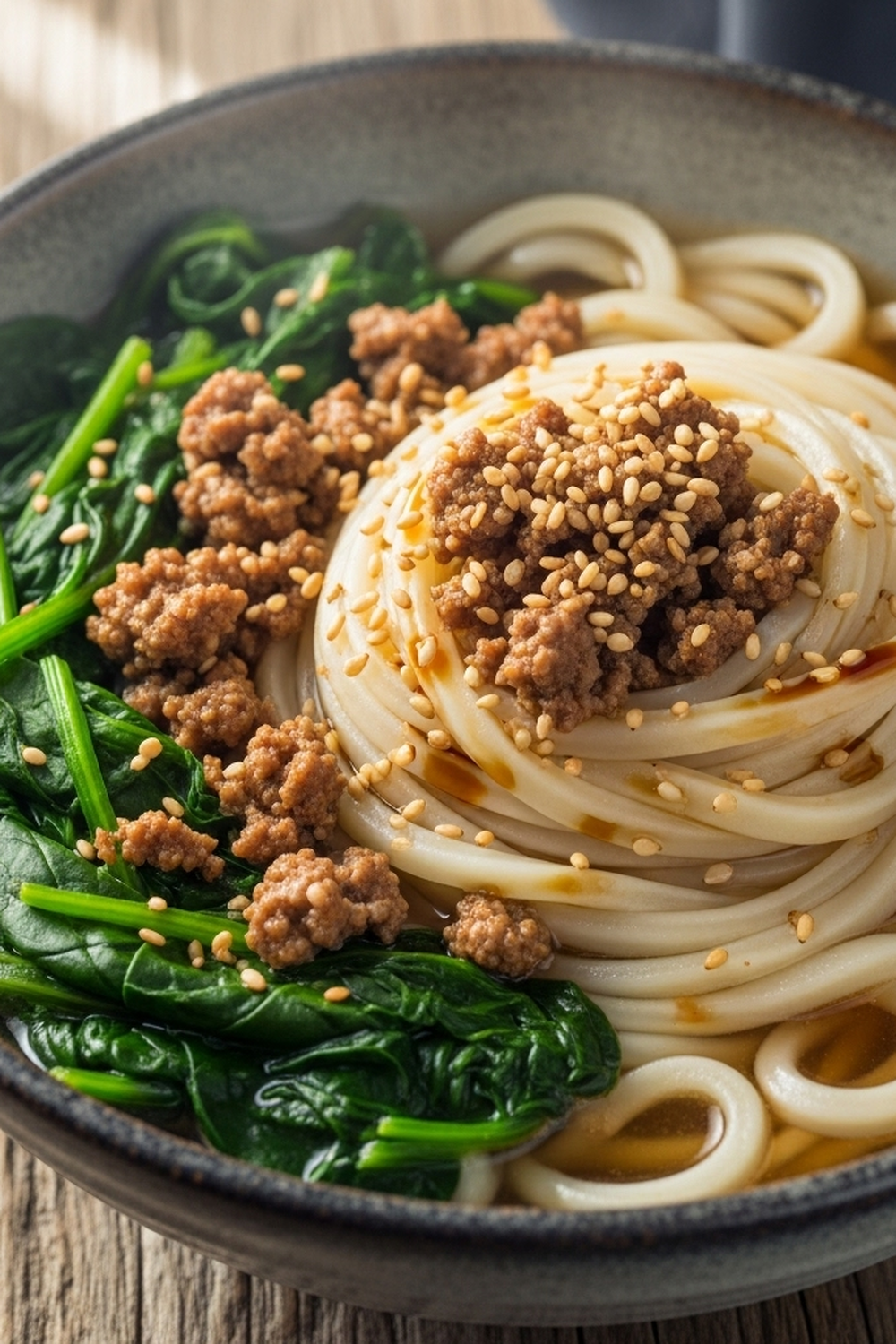 Udon-Nudeln mit Rinderhackfleisch und Spinat