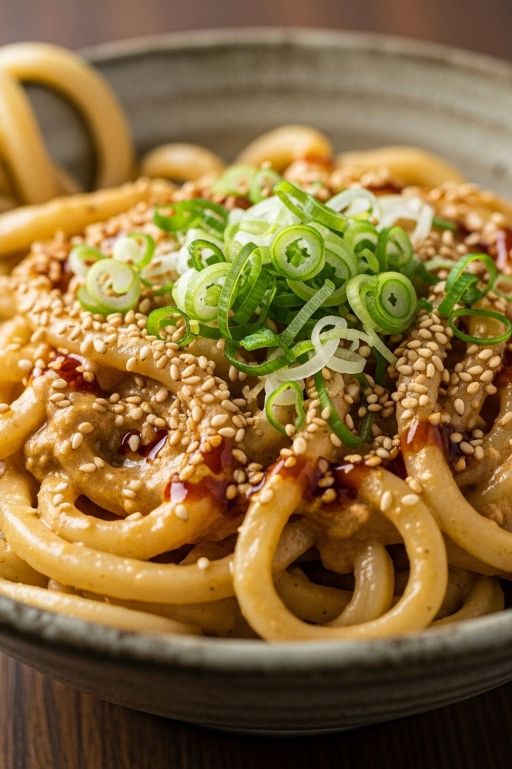 Cremige, samtige Nudeln, umhüllt von einer reichhaltigen, herzhaften Sauce, die deine Geschmacksknospen mit jedem Bissen verwöhnt. Ein Duft von geröstetem Sesam und frischen Kräutern steigt auf und verheißt ein unvergessliches Geschmackserlebnis.