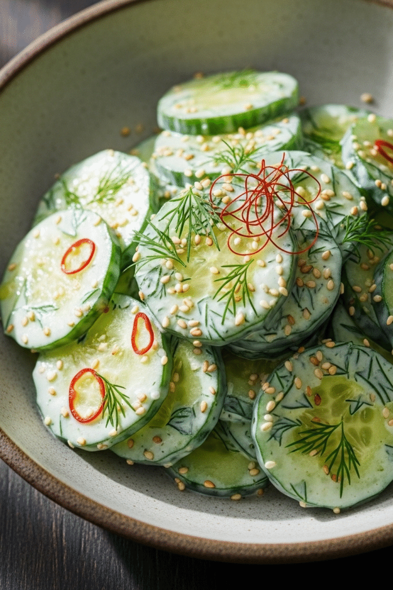 Knackige Gurken treffen auf cremige Soße, ein Hauch von Sesamöl und die subtile Schärfe von Chili. Ein Fest für die Sinne!