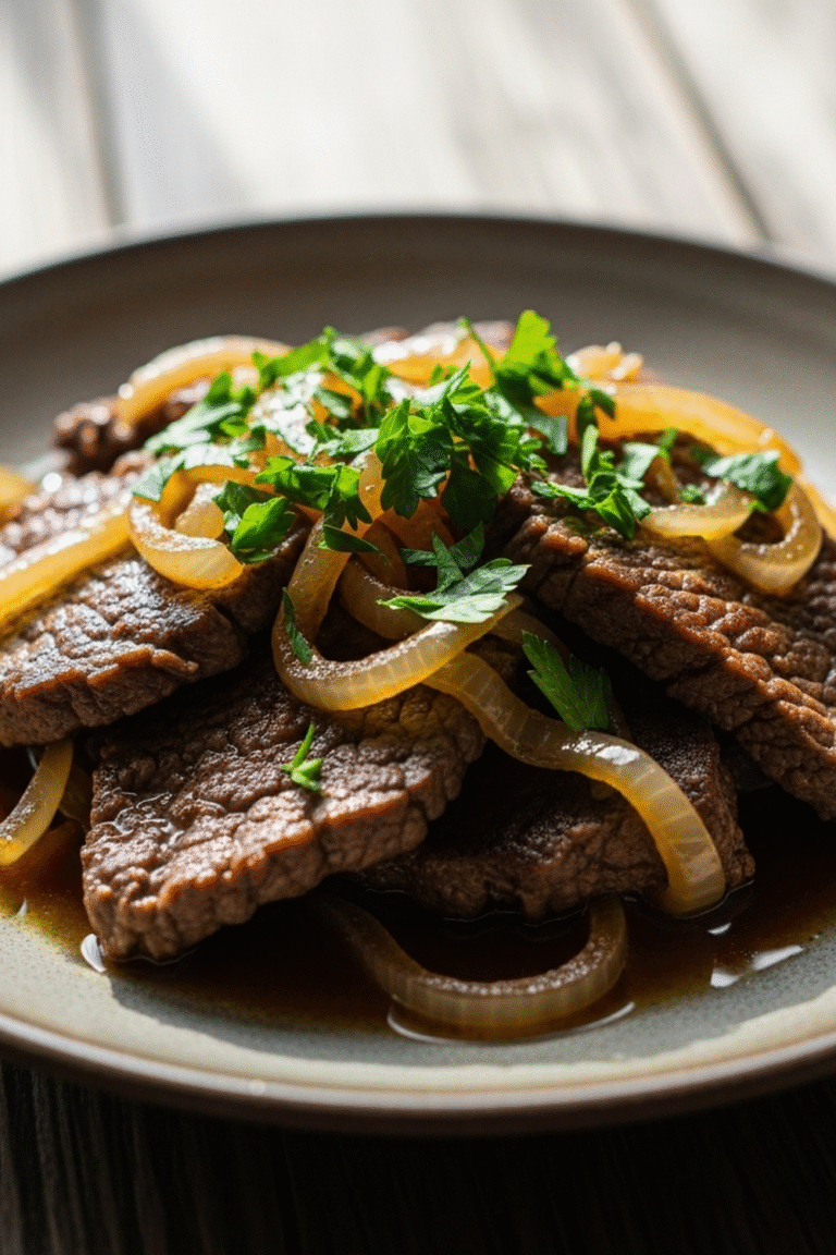 Die Hitze reduzieren und das Ganze zugedeckt köcheln lassen, bis das Rindfleisch zart ist und die Zwiebeln weich sind. Dies dauert in der Regel etwa 3045 Minuten. Gegebenenfalls noch etwas Brühe hinzufügen, damit nichts anbrennt. Mit frischer Petersilie garnieren und heiß servieren. Genießen Sie Einfaches Rindfleisch mit Zwiebeln selber machen.