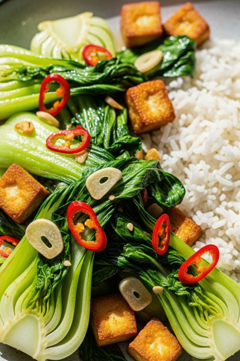 Gebratener Pak Choi mit knusprigem Tofu & Reis