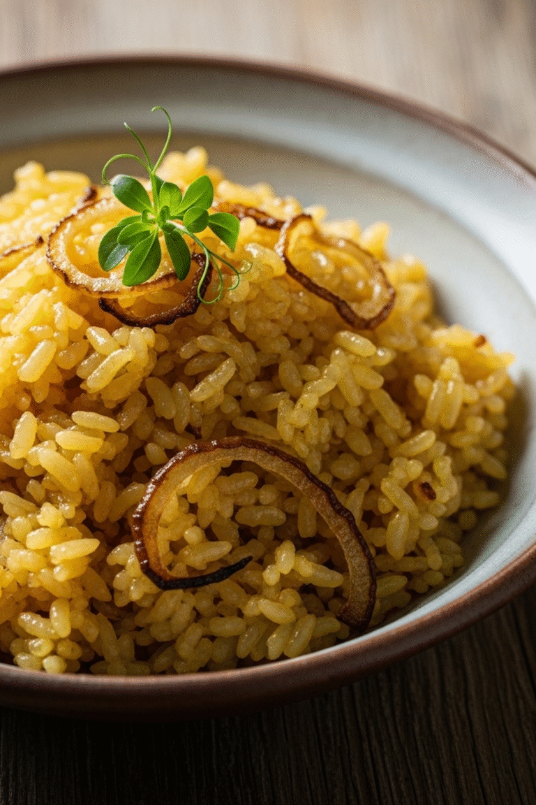 Es ist eine Symphonie von Aromen, die in Ihrem Mund tanzen, die Süße karamellisierter Zwiebeln trifft auf die reichhaltige Cremigkeit der Butter, alles eingebettet in die zarte Flauschigkeit des Reises. Ein Gericht, das sowohl beruhigend als auch aufregend ist.