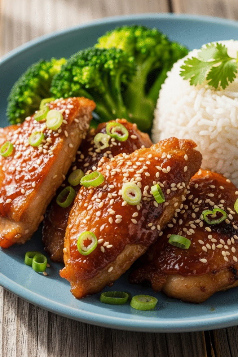 Ein Duft von süßer Sojasauce, Ingwer und geröstetem Sesam erfüllt die Luft, während zarte Hähnchenstücke in einer glänzenden, karamellisierten Glasur schimmern.