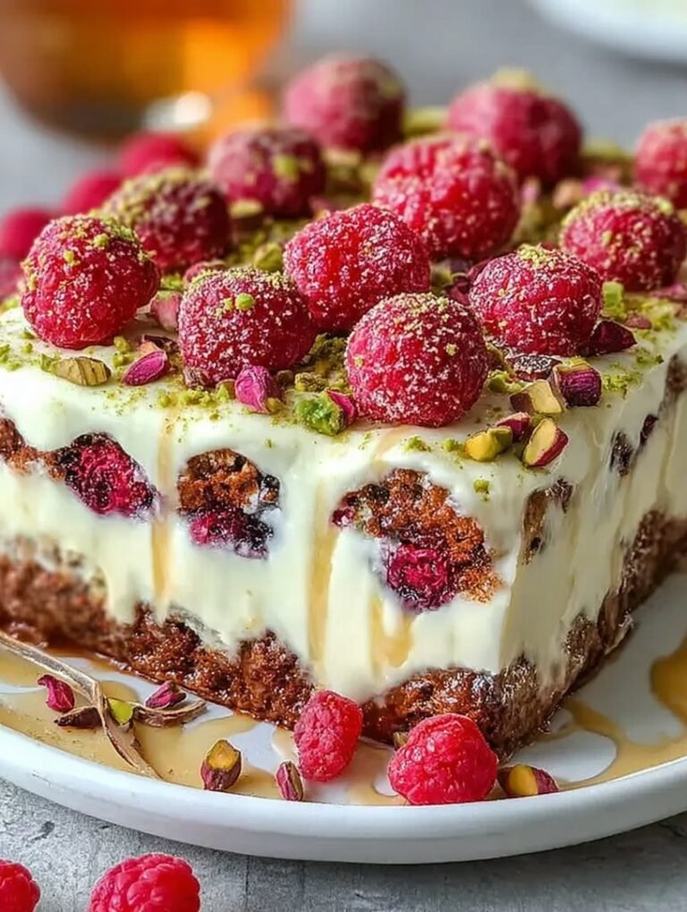 Verwenden Sie stattdessen reichlich gehackte, geröstete Pistazien, um die oberste Schicht zu bedecken. Die gerösteten Nüsse geben nicht nur einen schönen Crunch, sondern ihr leicht dunklerer Grünton bildet einen schönen Kontrast zur helleren Creme. Ein paar frische Himbeeren oder Erdbeeren an den Rändern können einen zusätzlichen Farbakzent setzen, ohne den nussigen Hauptgeschmack zu überdecken. Wenn Sie das Dessert portionieren, benutzen Sie ein scharfes, in warmes Wasser getauchtes Messer, um saubere Schnitte zu gewährleisten.