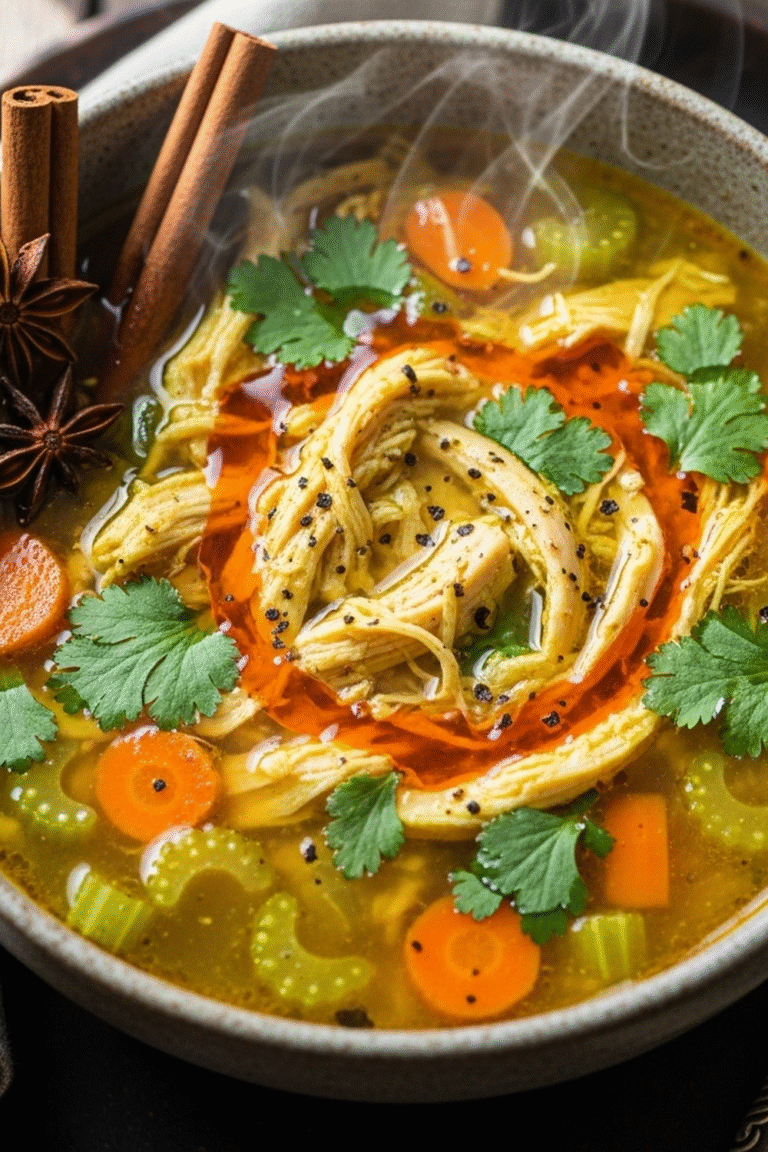Ein goldener Schimmer, der von frischer Kurkuma und Ingwer erzählt, vermischt mit dem beruhigenden Duft von Hühnerbrühe und zarten Kräutern. Ein Löffel davon ist wie eine herzliche Umarmung von innen.