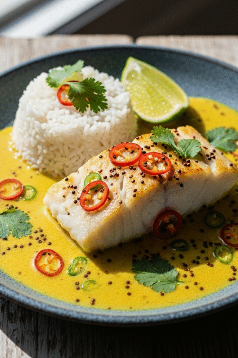 Kabeljau in exotischer Kokos-Curry-Sauce