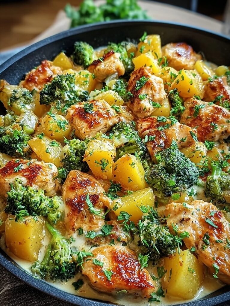 Wenn der Feierabend naht und der Kühlschrank nur noch vage Hoffnungen verspricht, kommt unsere Retterin in der Not: die ultimativeKartoffel-Hähnchen-Pfanne mit Brokkoli. Diese Pfanne duftet so unglaublich gut, dass selbst die Nachbarn neidisch werden. Ein Teller voller Komfort, der nach einem langen Tag wie eine warme Umarmung schmeckt – schnell zubereitet und einfach unschlagbar lecker, ohne dass die Küche danach aussieht, als hätte eine Küchenschlacht stattgefunden.