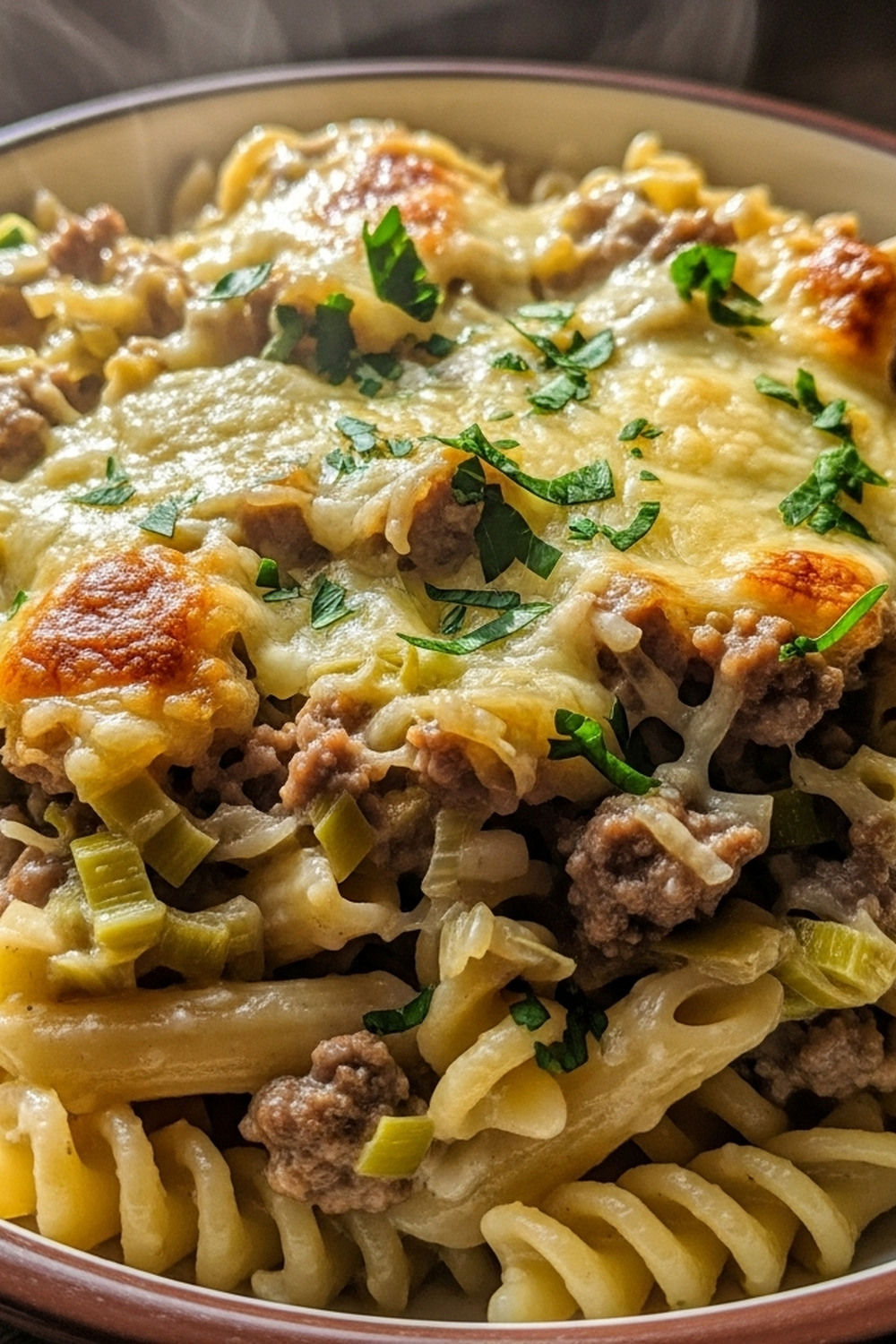Eine unwiderstehliche Kombination aus cremiger Soße, würzigem Hackfleisch und zartem Lauch, die jeden begeistert.