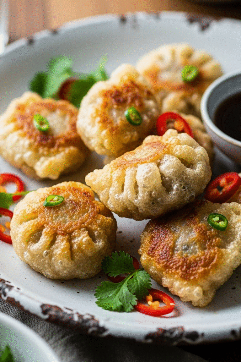 Servieren: Nimm die knusprigen Reispapierklöße aus der Pfanne und lasse sie auf Küchenpapier abtropfen. Serviere sie warm mit deiner LieblingsDipSauce.