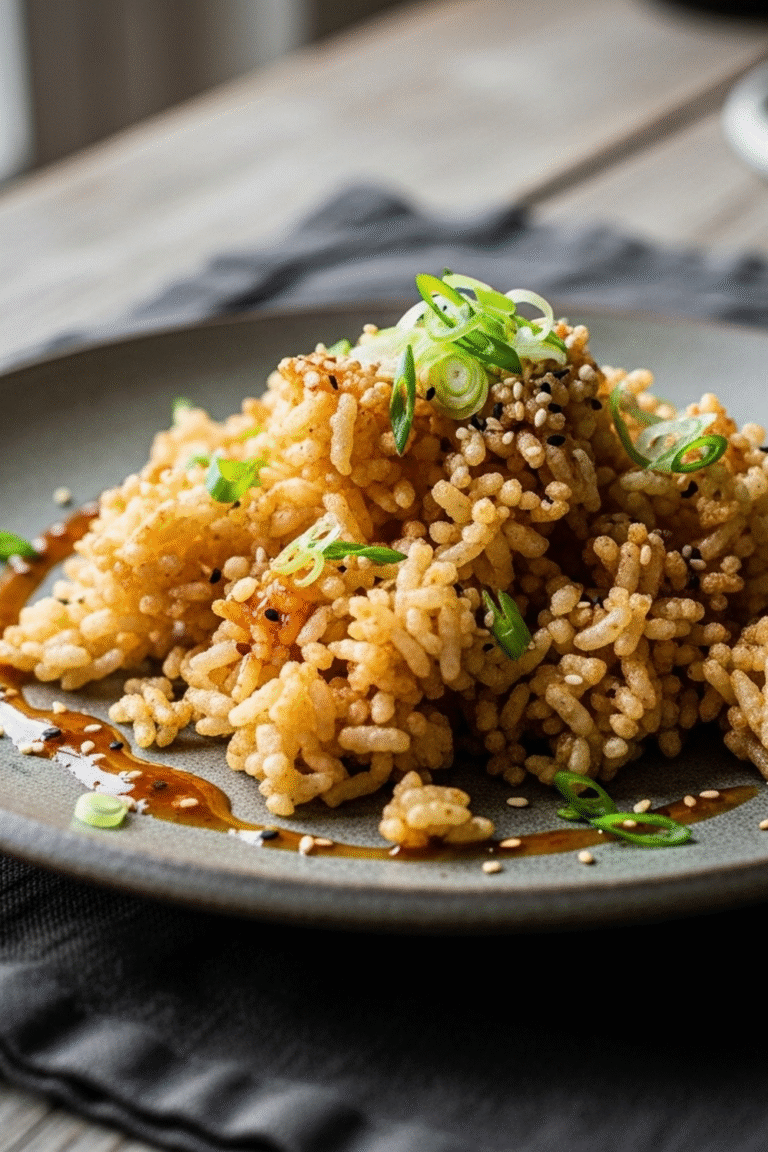 Die goldene Farbe und die knusprige Textur machen den knusprigen Reis zu einem optischen Genuss auf jedem Teller.
