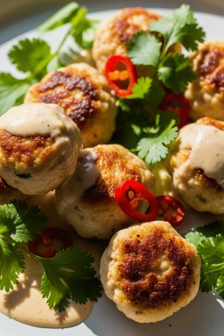 5. Step 5: Die Kokos-Hähnchen-Fleischbällchen heiß servieren, eventuell mit Reis und einem Dip nach Wahl.