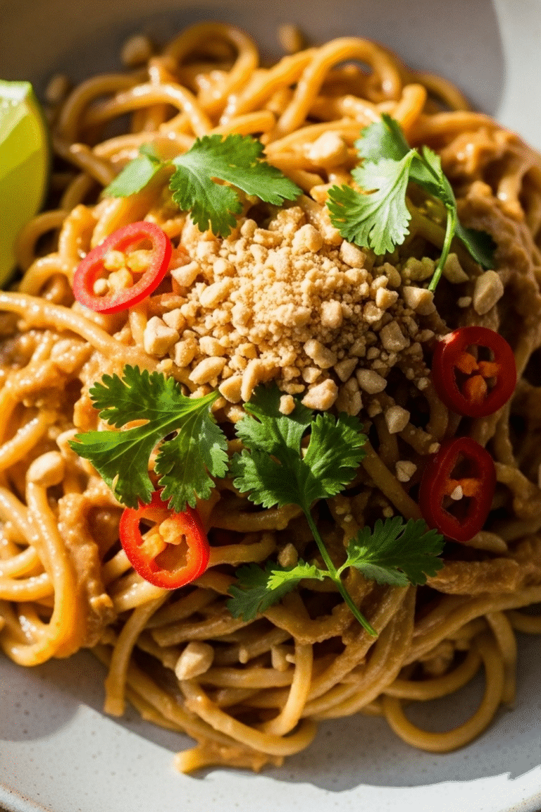 5. Step 5: Die Nudeln mit Erdnusssauce sofort servieren. Optional mit gehackten Erdnüssen, Frühlingszwiebeln oder Chili garnieren.