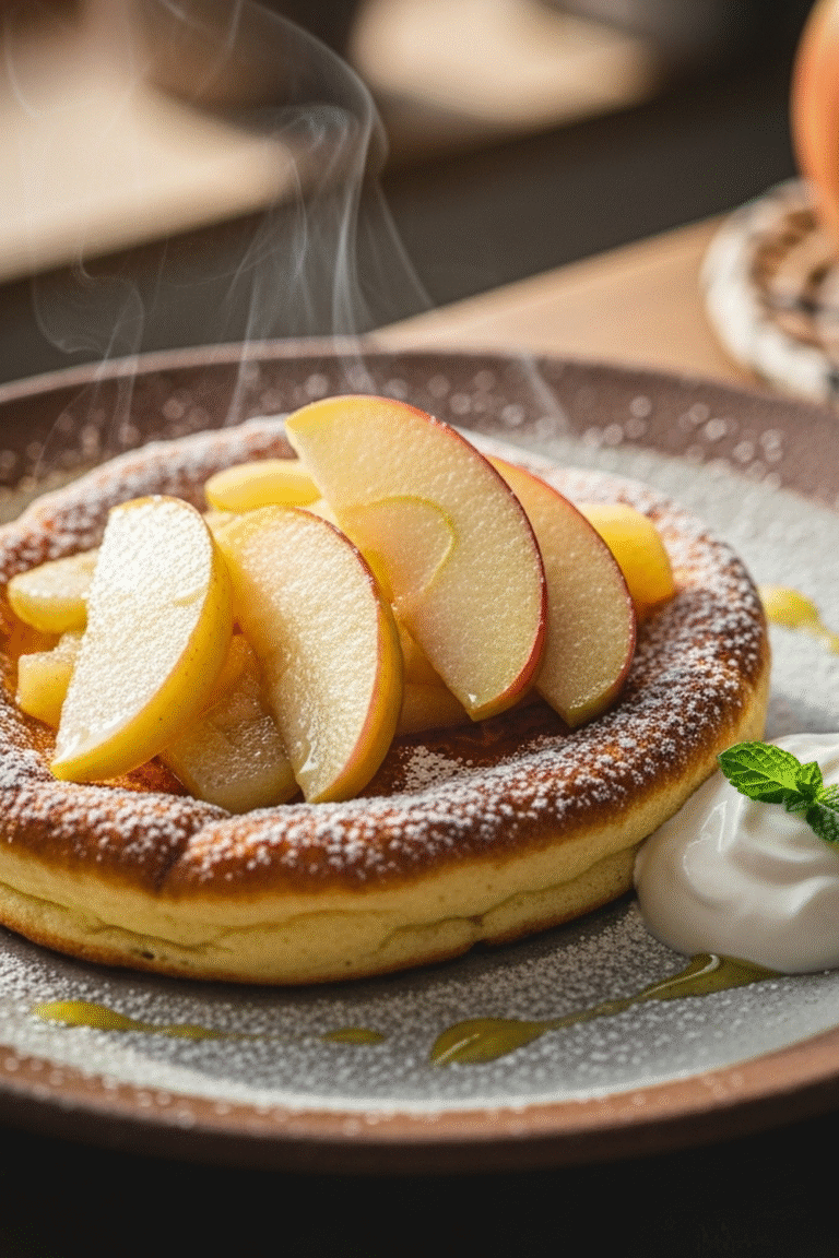 - Step 6: Die fertigen Milchpuffer mit Apfel auf einem Teller anrichten und nach Belieben mit Puderzucker bestäuben. Sofort servieren.