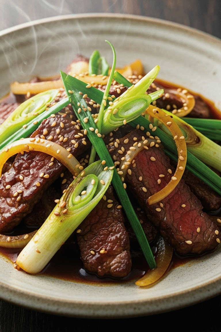 Saftige Rindfleischstreifen, umhüllt von einer süßlichwürzigen Soße, tanzen auf der Zunge, begleitet von der knackigen Frische von Frühlingszwiebeln und geröstetem Sesam. Ein Fest für die Sinne!