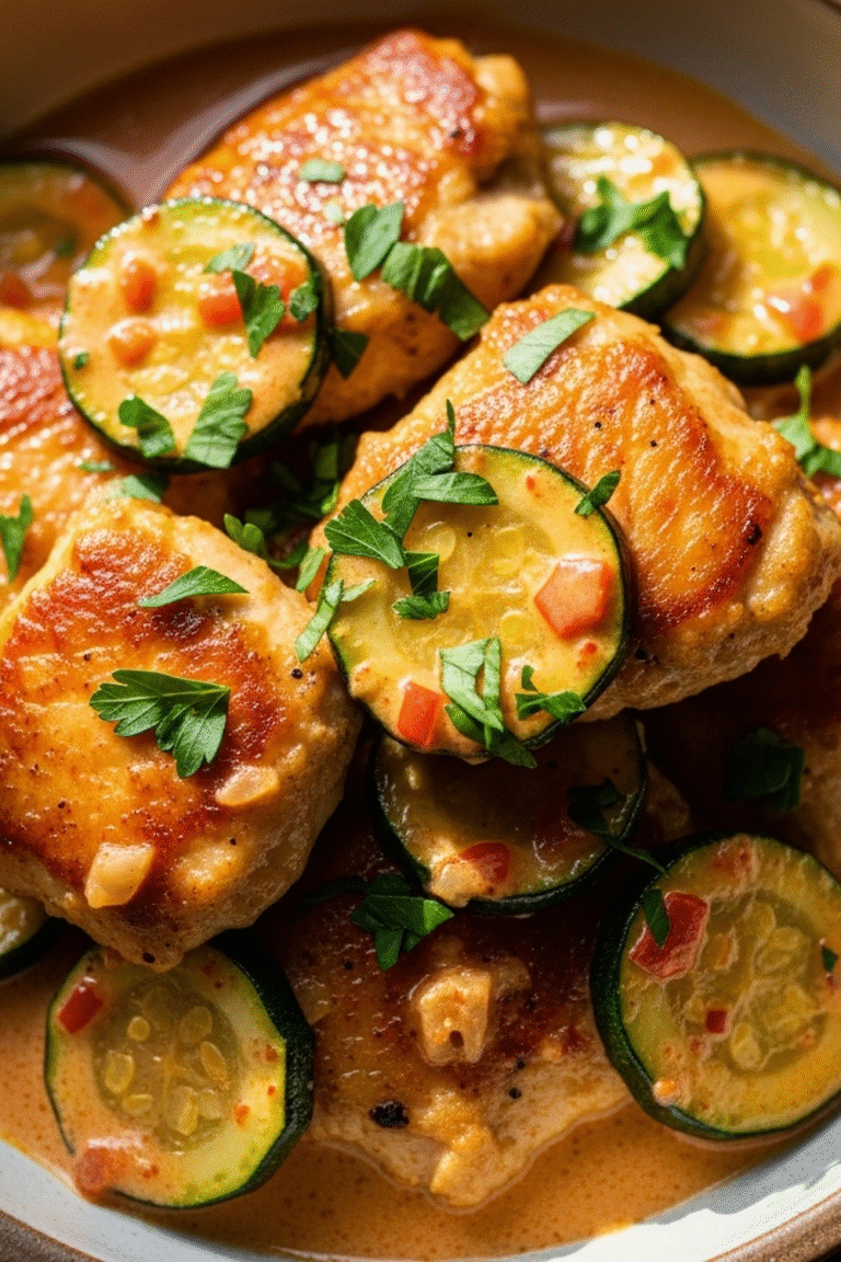 Ein Duft von geräuchertem Paprika, die sanfte Süße der Zucchini, und eine cremige Sahnesauce umhüllen zarte Hähnchenstücke. Ein Fest für die Sinne, das Wärme und Geborgenheit verspricht.