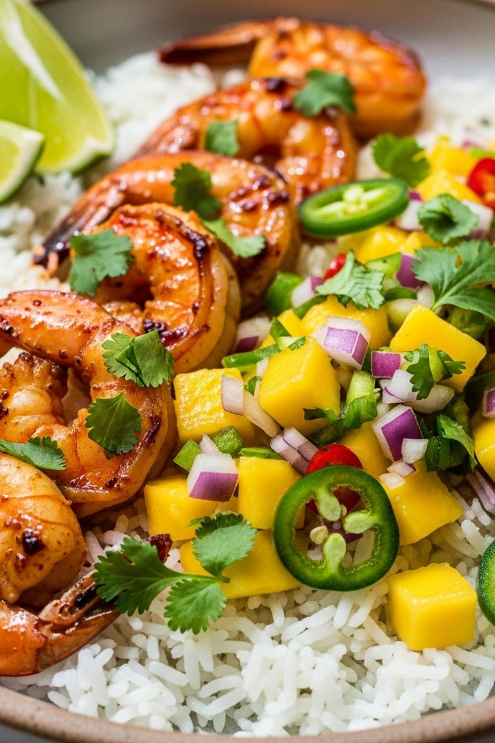 Pikante Garnelen und Mango Salsa Reisbowl