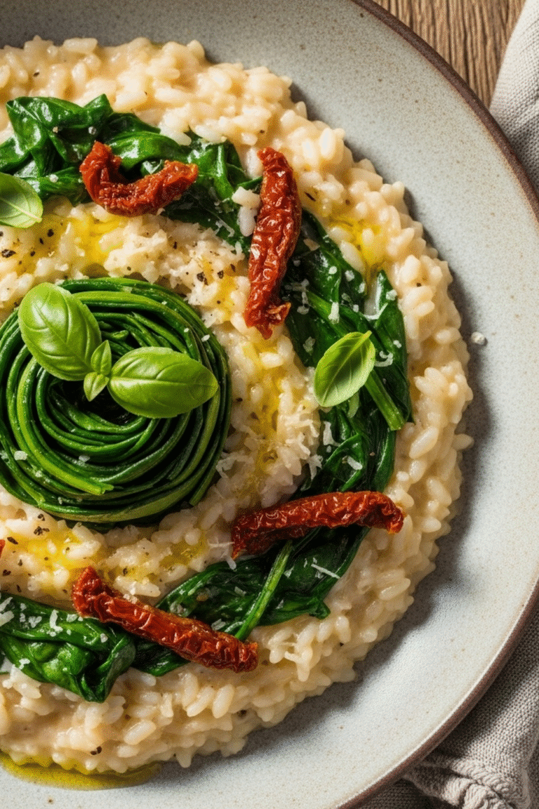 Dieses Risotto mit sonnengetrockneten Tomaten und Spinat ist ein echtes Highlight: Es vereint cremige Textur mit dem intensiven Geschmack sonnengetrockneter Tomaten und der Frische von Spinat. Es ist ein Gericht, das sowohl einfach zuzubereiten als auch unglaublich befriedigend ist.
