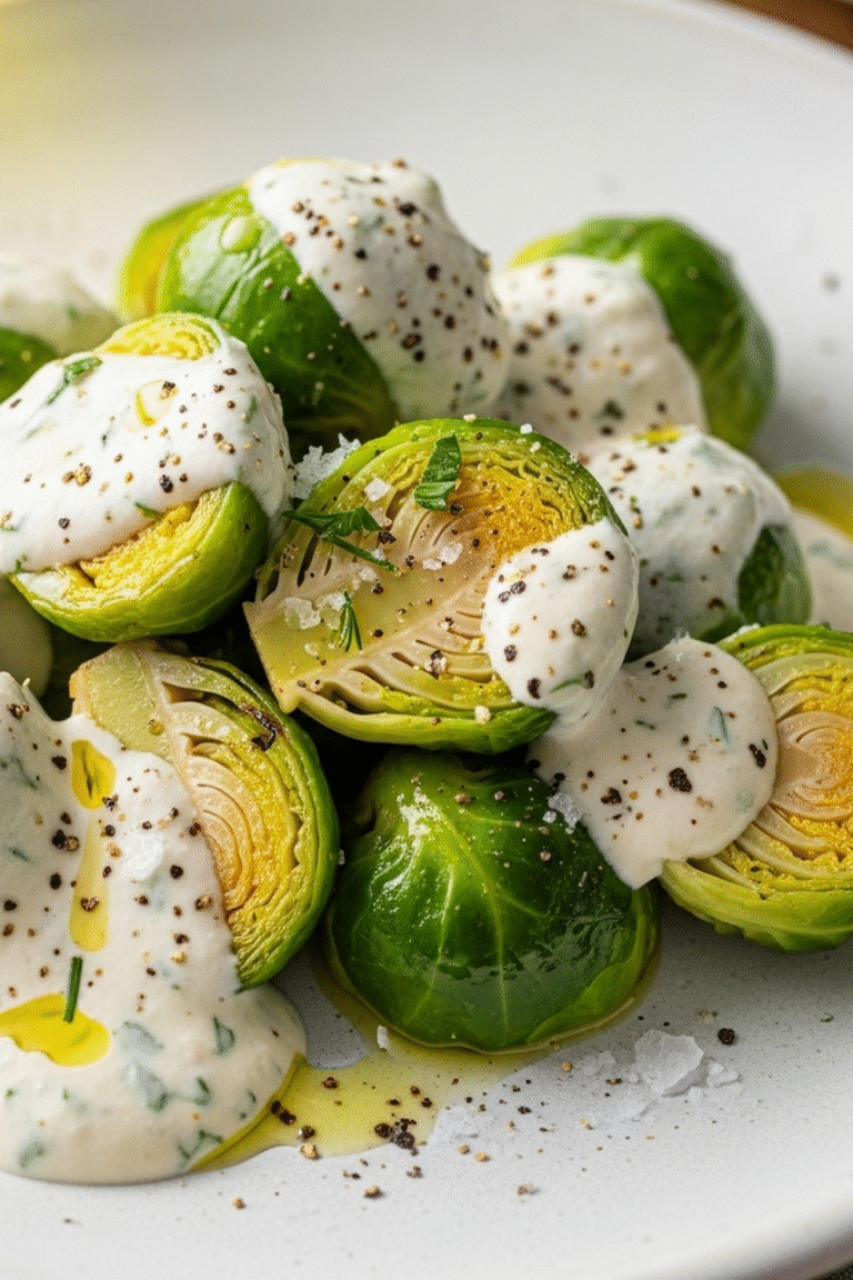 Die lebendige grüne Farbe des Rosenkohls in Kombination mit der cremigen Sauce ist ein echter Hingucker.