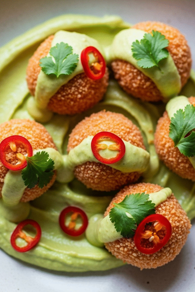 Vegetarische Gäste: Ersetzen Sie den Lachs durch gehackten Tofu oder Kichererbsen. Fügen Sie Algenblätter hinzu, um einen fischähnlichen Geschmack zu erzielen. Salmon Balls with Creamy Avocado Sauce: