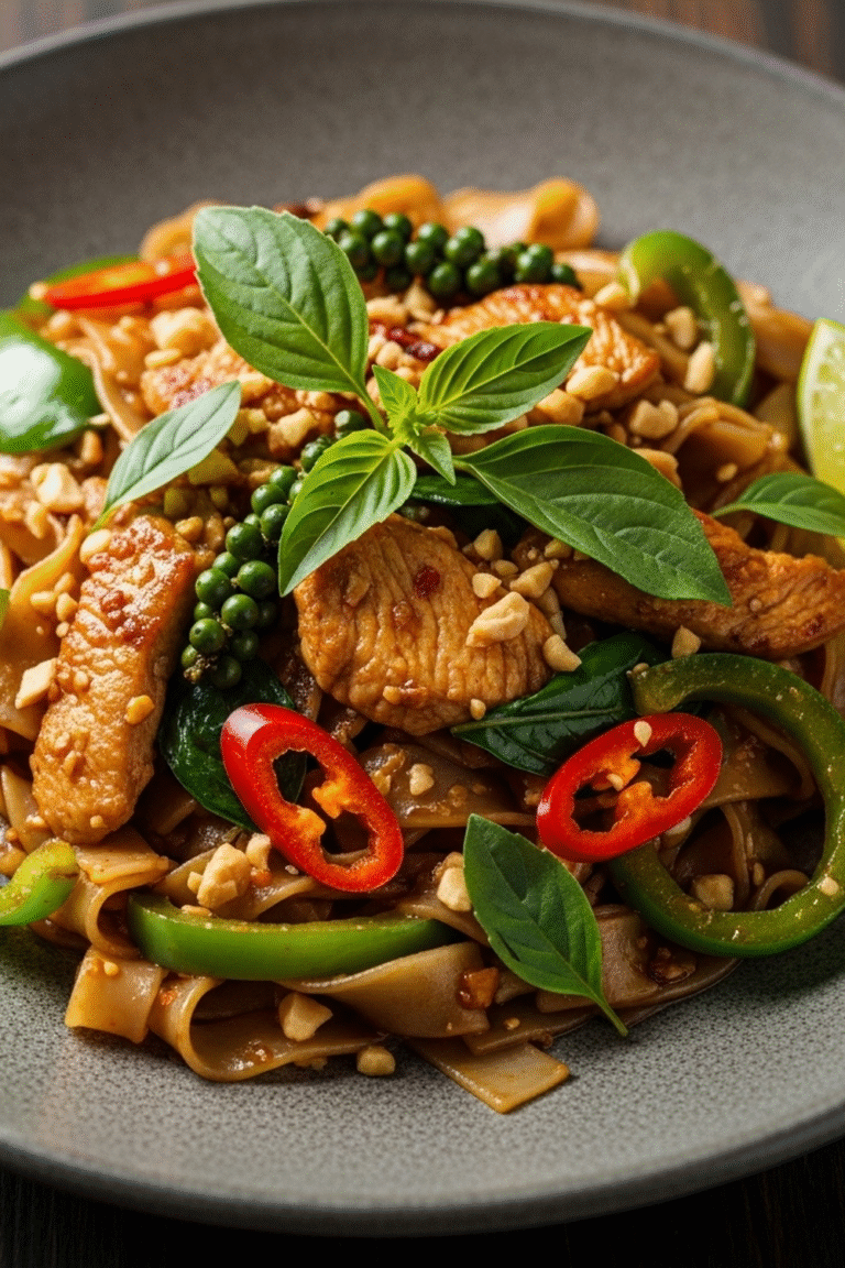 Ein Fest für die Sinne: Garniere das Gericht mit frischem Basilikum und serviere es sofort. Genieße die Aromen der scharfen betrunkenen Nudeln mit Hühnchen.