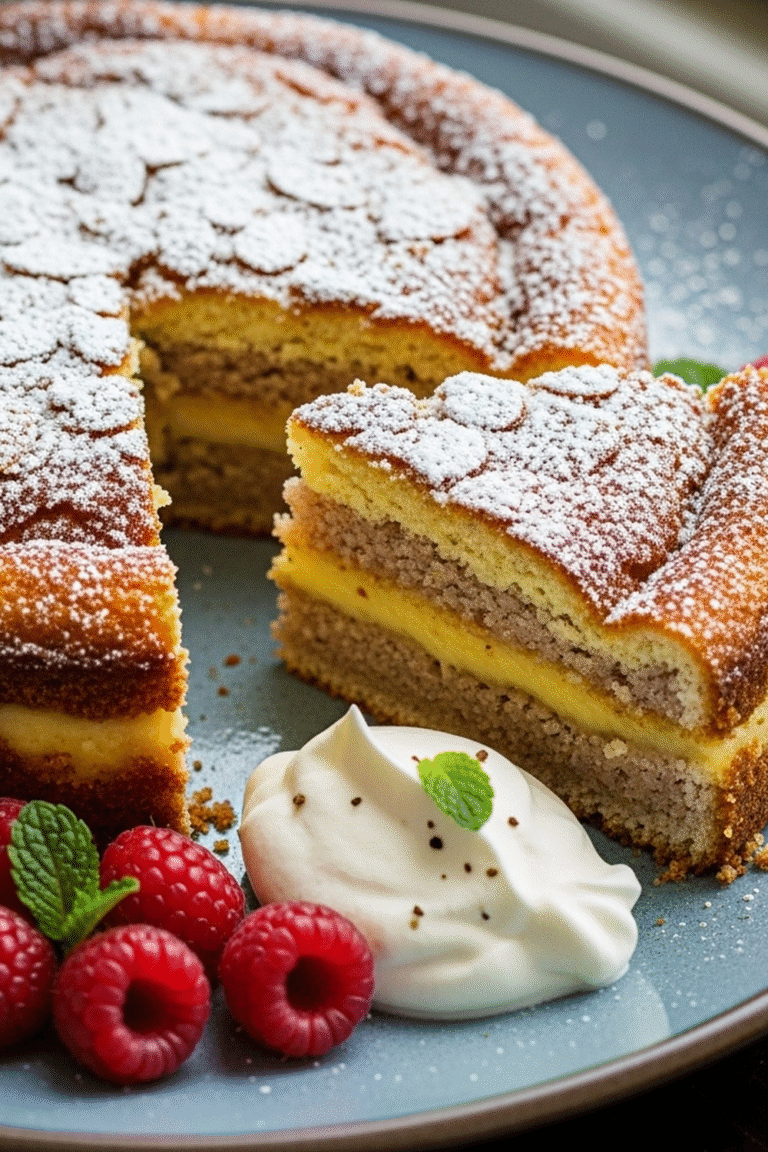 Sobald die Böden vollständig abgekühlt sind, legen Sie einen Boden auf eine Servierplatte. Verteilen Sie die Hälfte der Creme gleichmäßig darauf. Legen Sie den zweiten Boden darauf und bedecken Sie ihn mit der restlichen Creme. Bestäuben Sie die Torte großzügig mit Puderzucker und dekorieren Sie sie nach Belieben mit Mandelblättchen oder frischen Beeren.