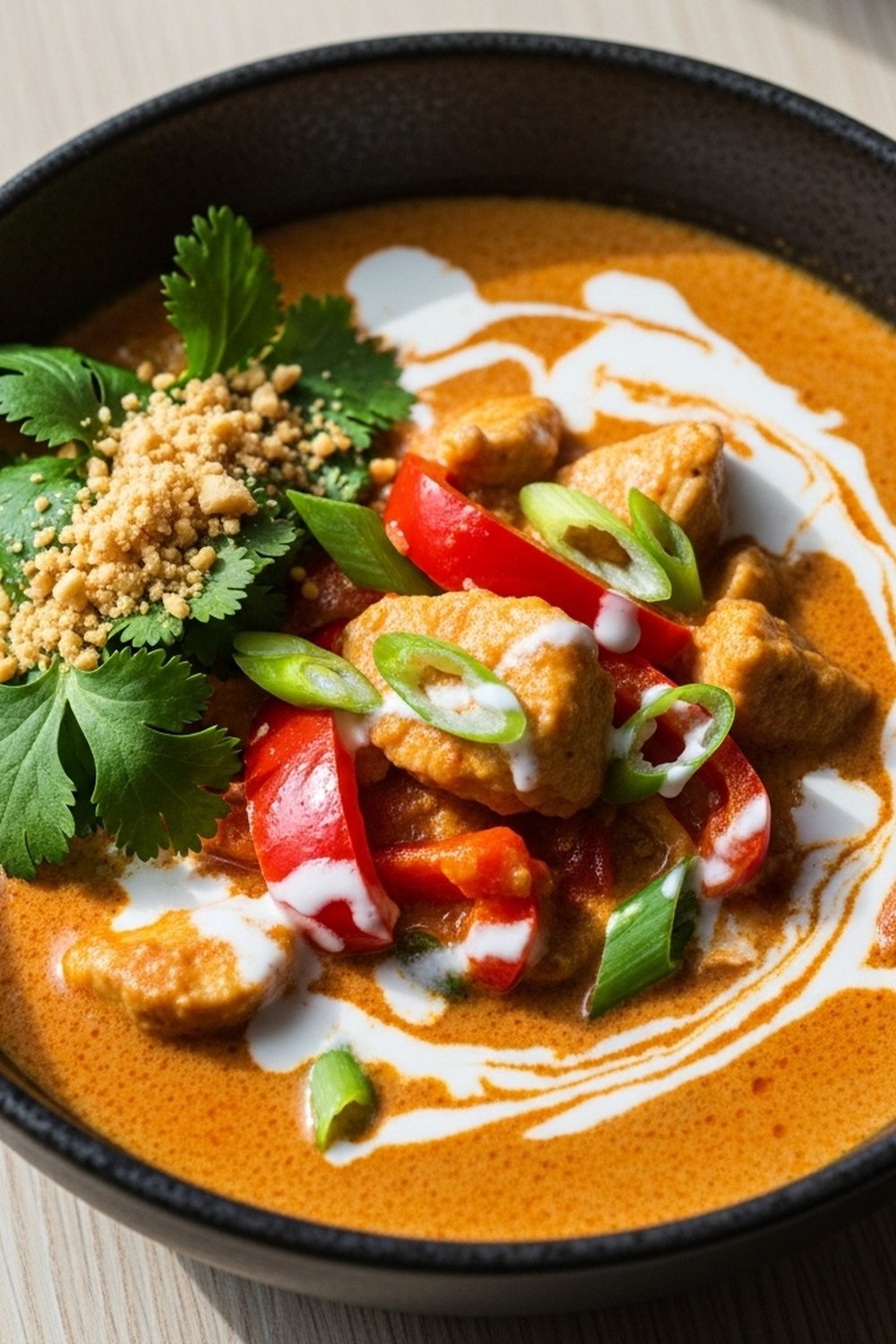 Schmecken Sie das Curry mit Salz und Pfeffer ab. Fügen Sie gehackte Erdnüsse und frischen Koriander hinzu. Servieren Sie das Thai ErdnussCurry mit Kokosmilch über Reis oder Nudeln. Garnieren Sie es mit Limettenspalten und Chiliflocken für zusätzlichen Geschmack und Schärfe. Guten Appetit!