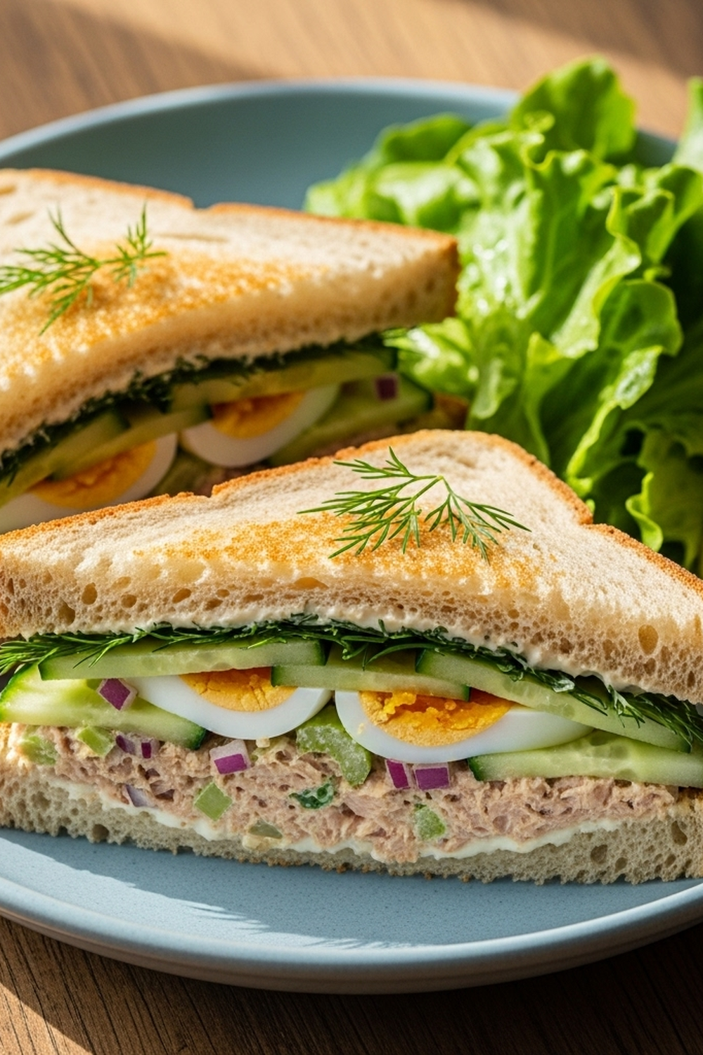 Servieren Sie Ihr Thunfisch Sandwich mit Ei und Gurke mit einer Beilage frischer Früchte oder einem knackigen Salat für eine komplette und befriedigende Mahlzeit.