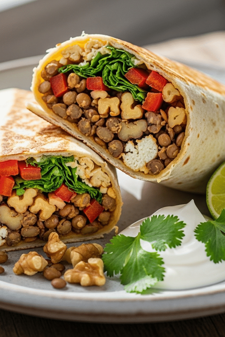 Diese vegetarischen Burritos mit Linsen und Walnüssen sind ein einfaches, sättigendes und unglaublich leckeres Gericht, das perfekt für ein schnelles Mittagessen, ein unkompliziertes Abendessen oder sogar eine Mahlzeit zum Mitnehmen geeignet ist. Was sie besonders macht, ist die Kombination aus herzhaften Linsen, knackigen Walnüssen und aromatischen Gewürzen, die in einer weichen Tortilla zu einem wahren Gaumenschmaus verschmelzen.