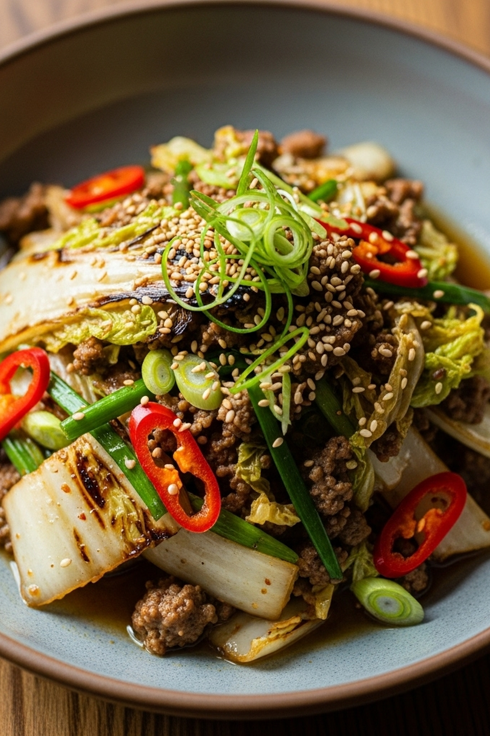 Ein Fest für die Augen: Die leuchtenden Farben des Chinakohls und des Rinderhacks machen dieses Gericht zu einem echten Hingucker.